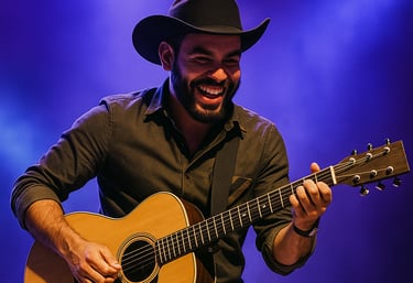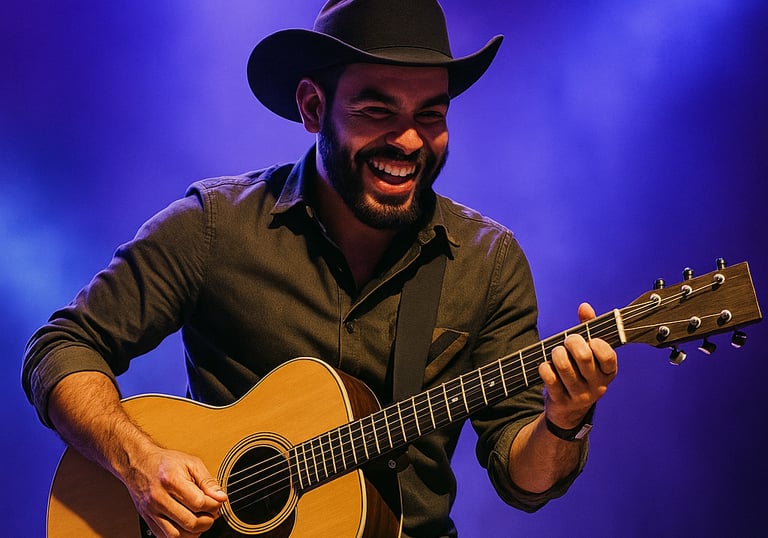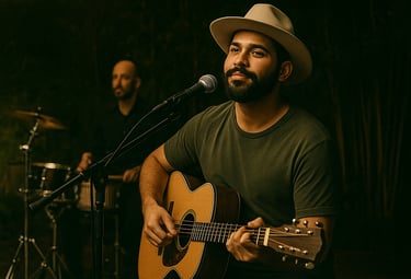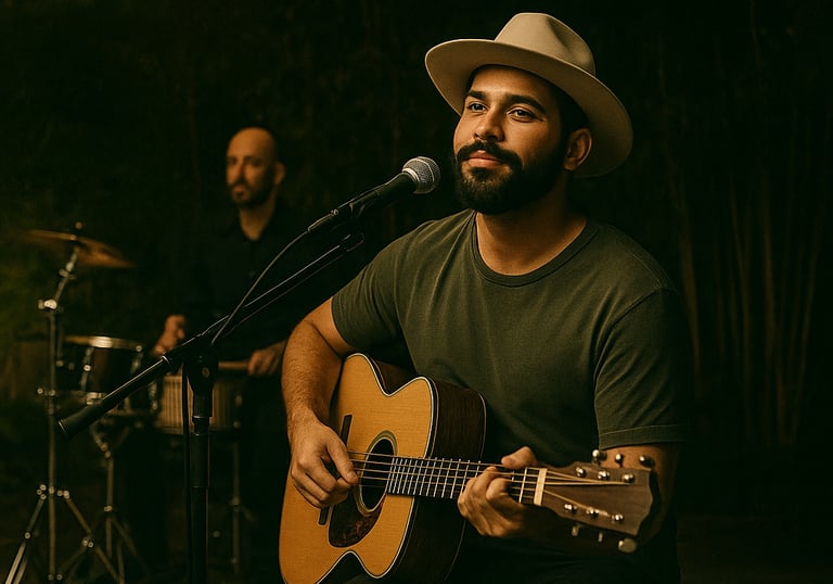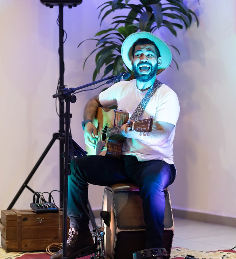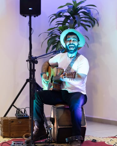 Tudo em um só artista: voz, violão, beat e presença.